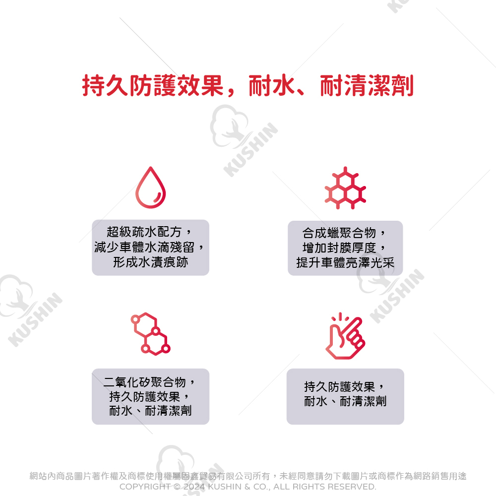 超級疏水配方、阻隔髒汙、透亮光澤、持久防護,完美呈現!