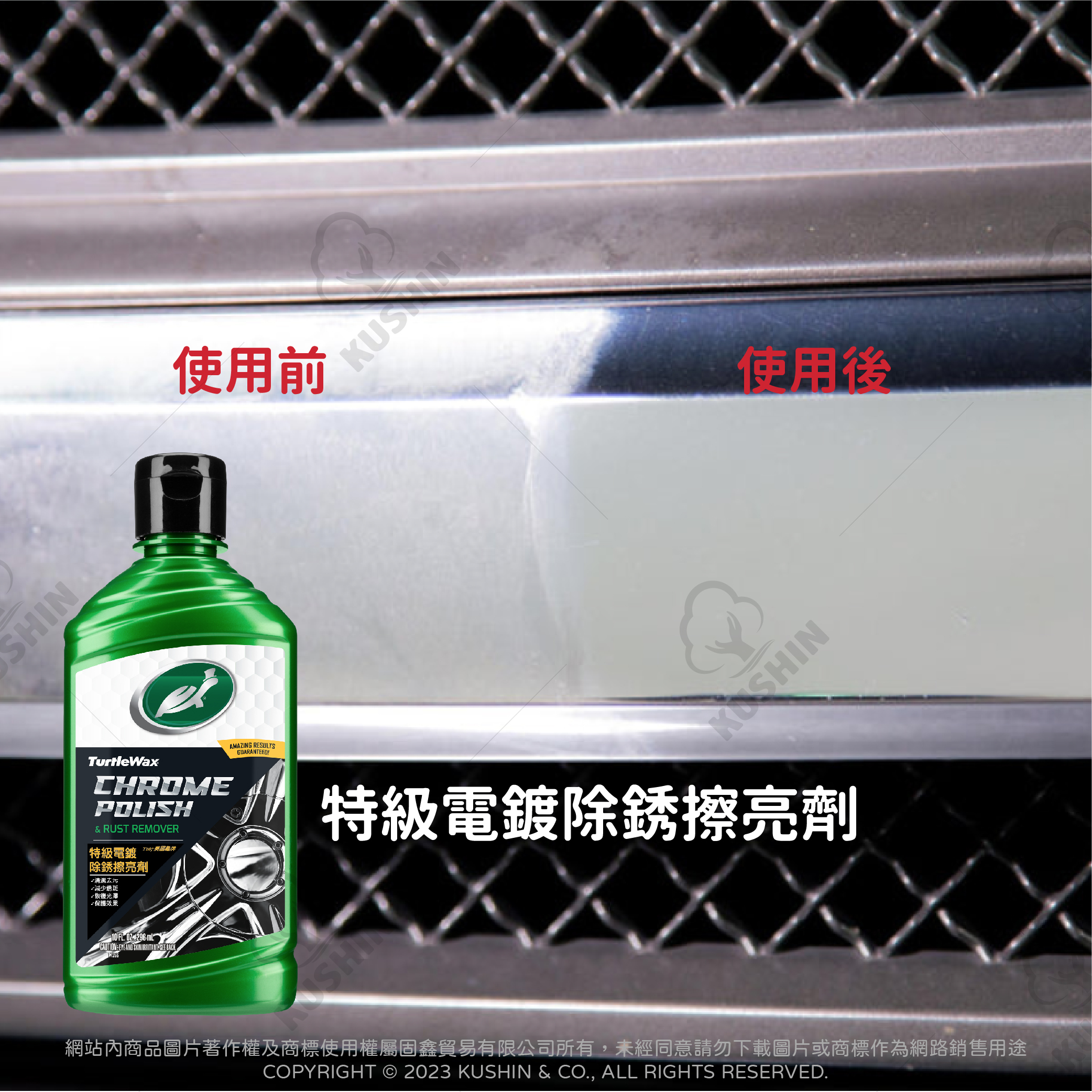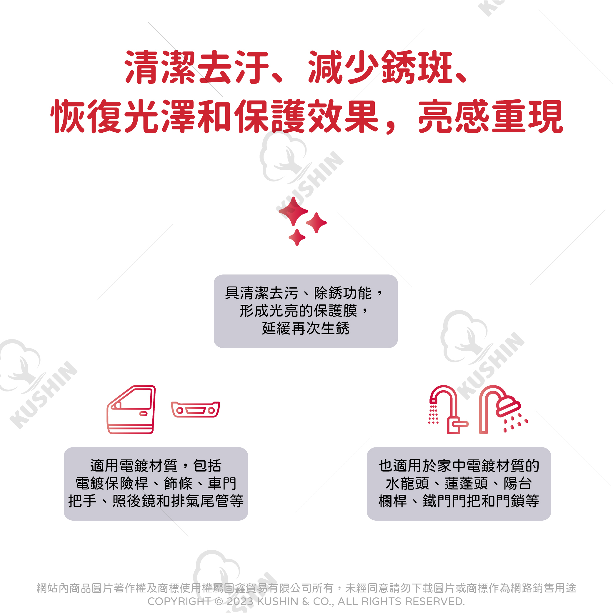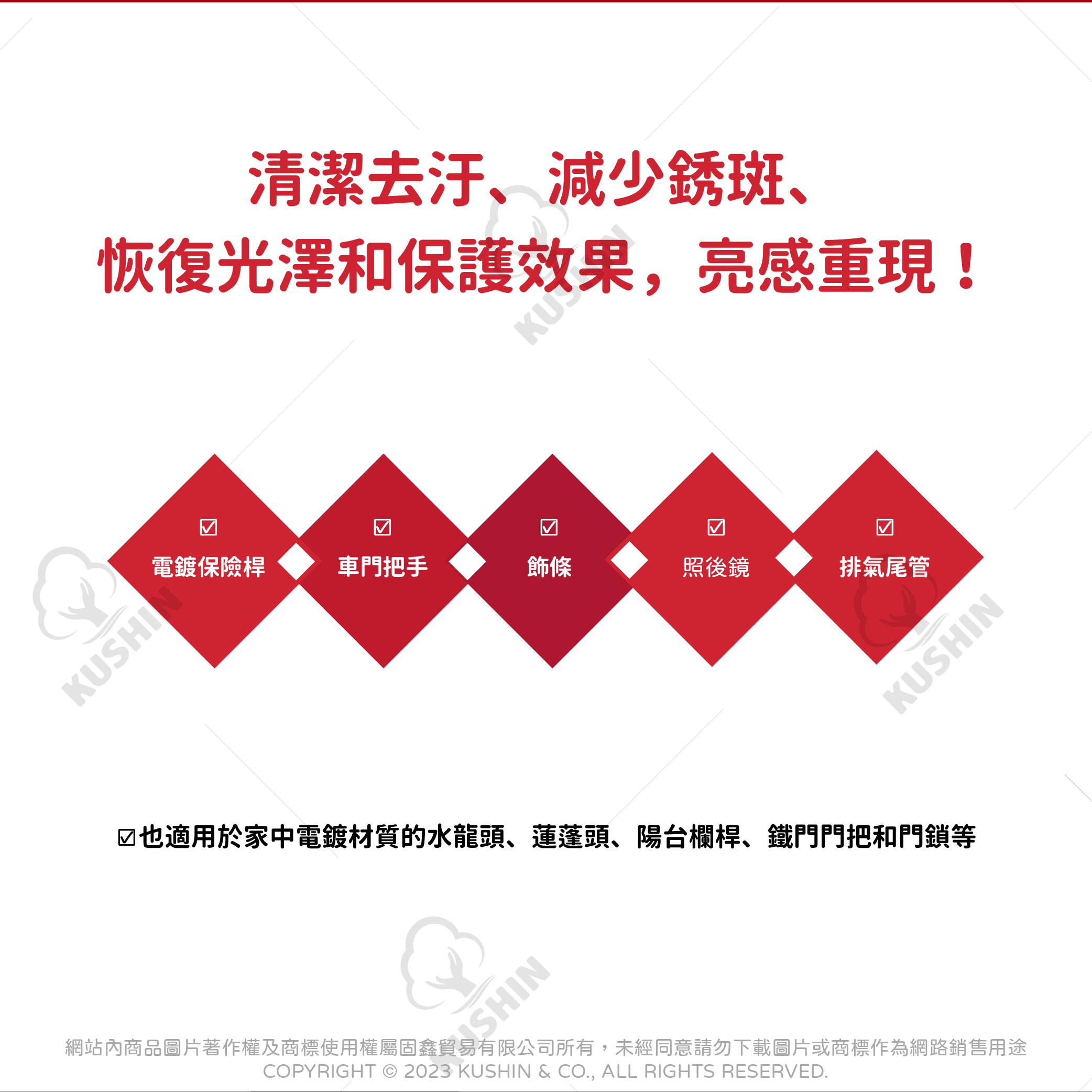 ★適用電鍍材質,包括電鍍保險桿、車門把手、飾條、照後鏡和排氣尾管等