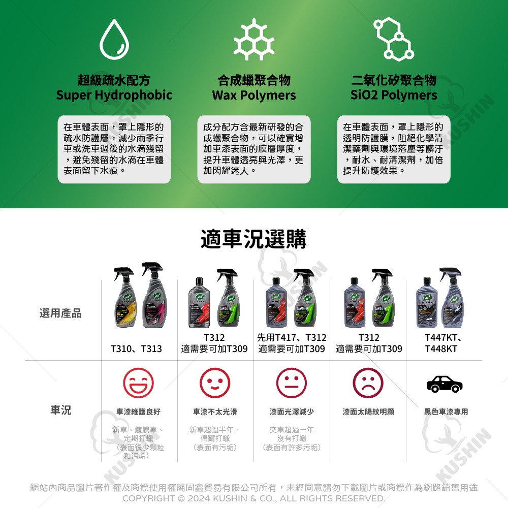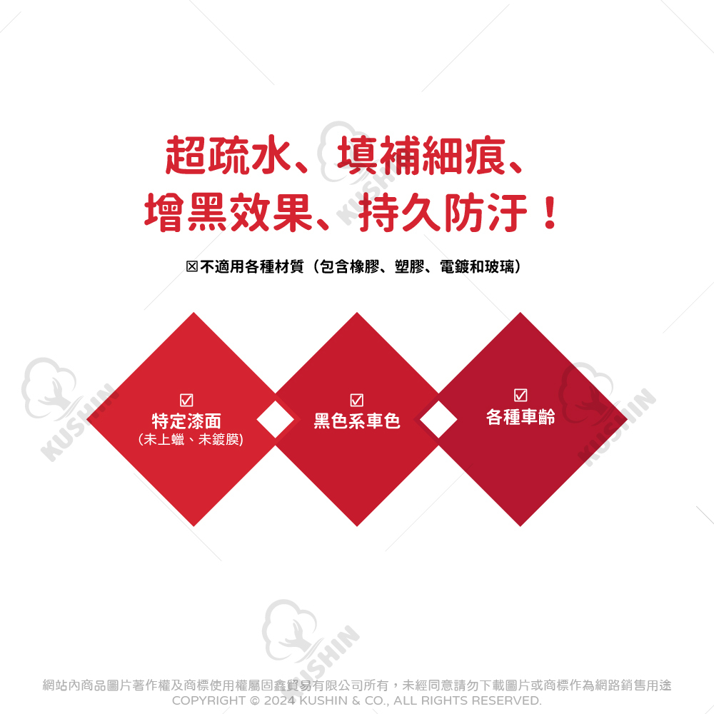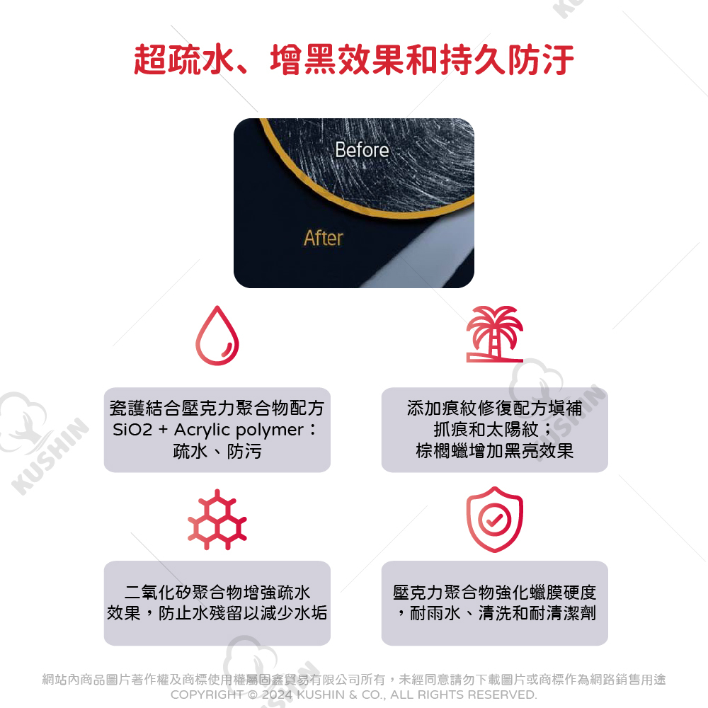 ★填補細微抓痕和太陽紋;棕櫚蠟成份增強黑亮效果