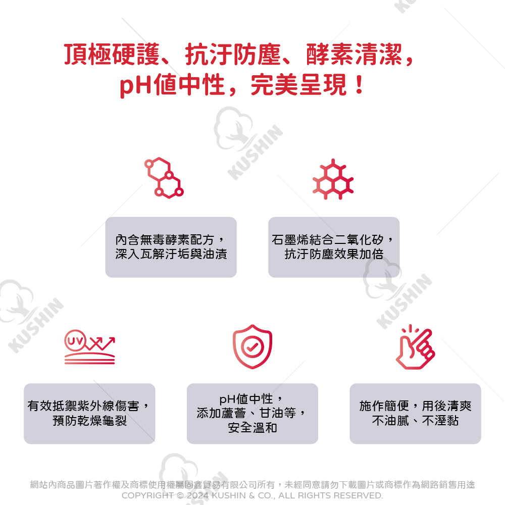 頂級硬護、抗汙防塵、酵素清潔,pH值中性,完美呈現!