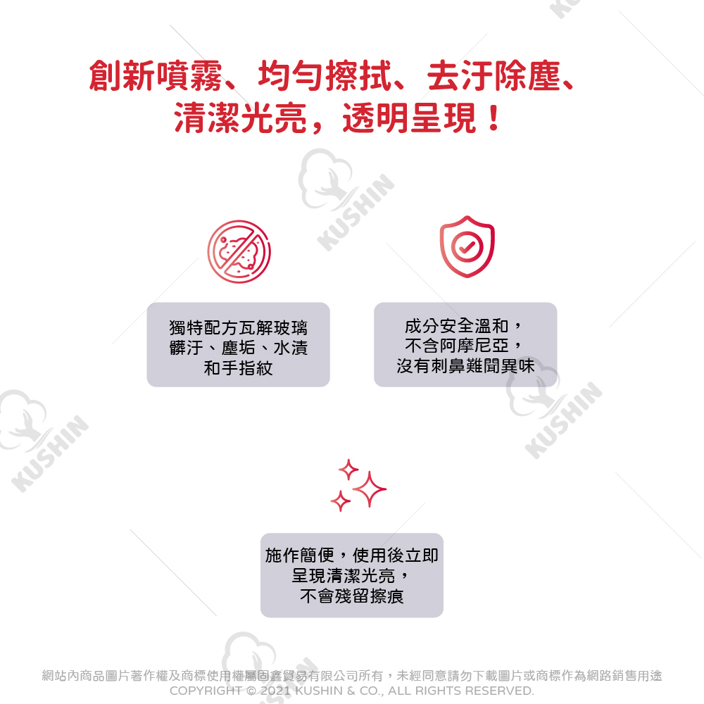 創新噴霧、均勻擦拭、去汙除塵、清潔光亮,透明呈現!