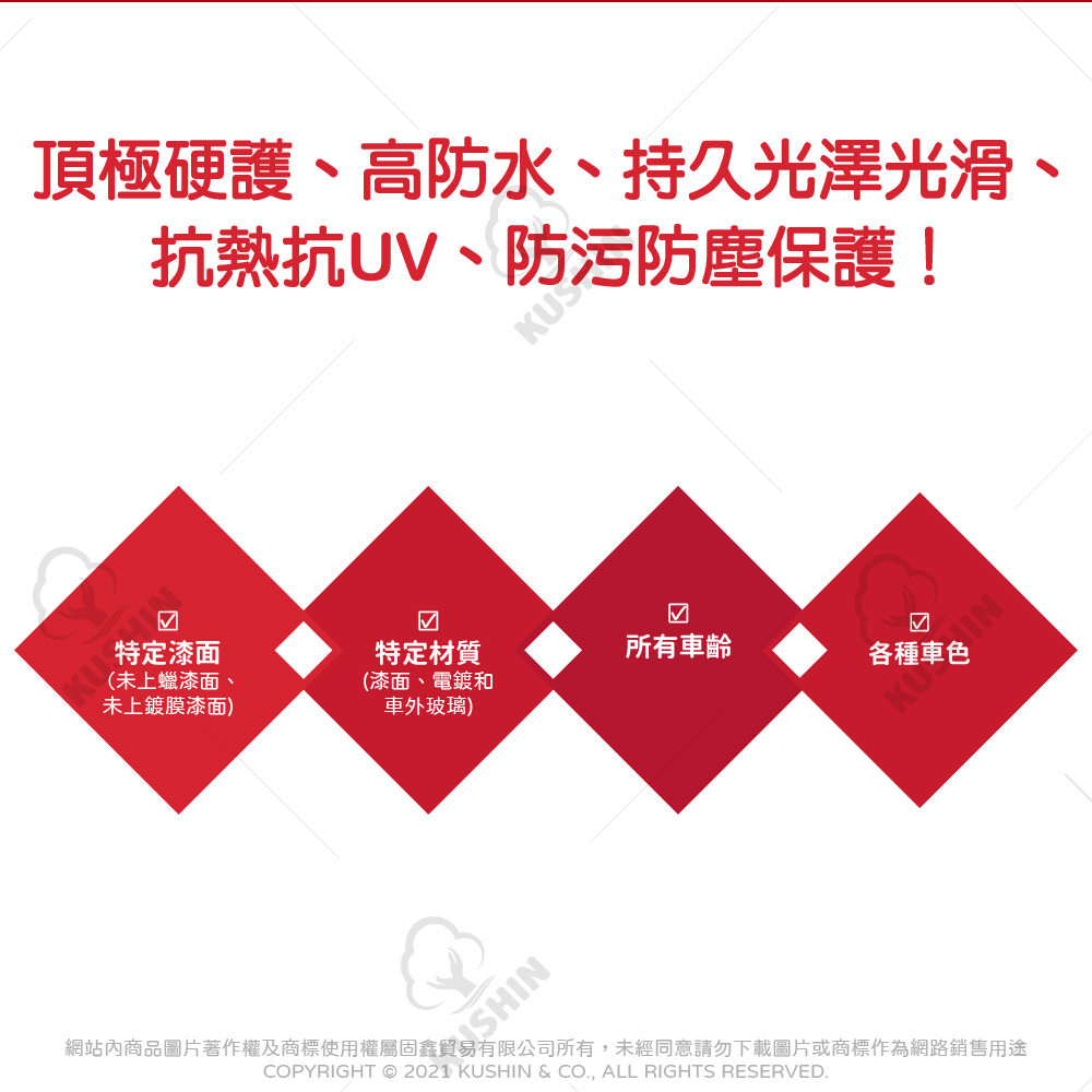 頂極硬護、高防水、持久光澤光滑、抗熱抗UV、防污防塵保護!