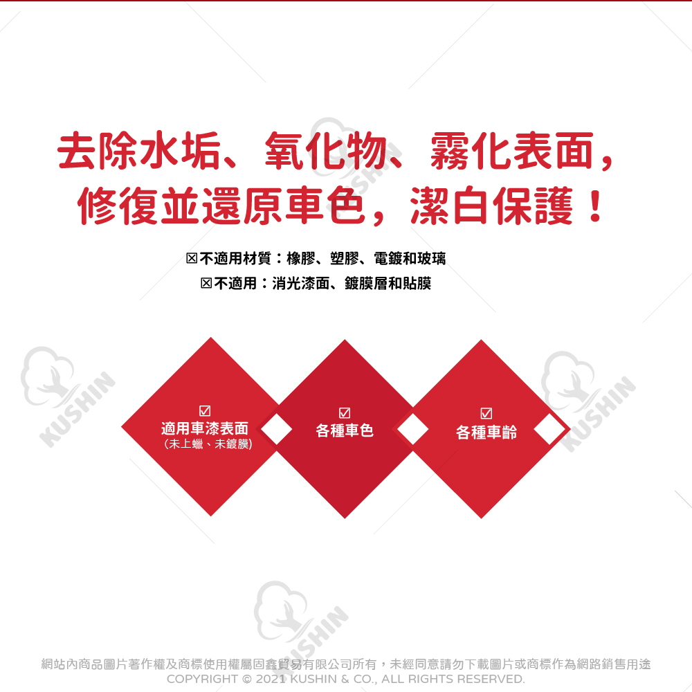 ★去除水垢、氧化物和些許霧化表面、修復並還原車色