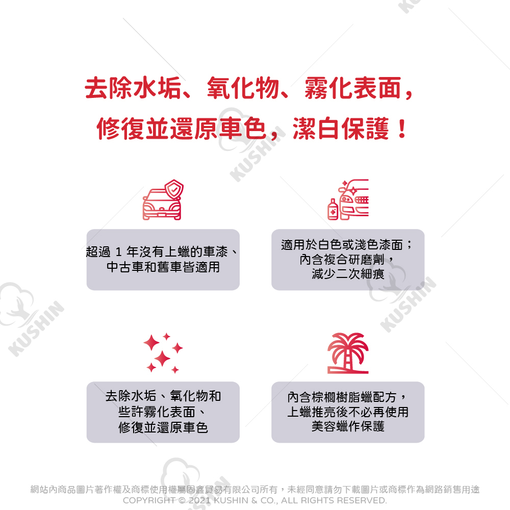 ★適用於白色或淺色漆面;內含複合研磨劑,減少二次細痕